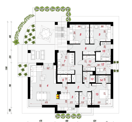 Casa Ametrin este o casa spatioasa, aerisita, alcatuita din 4 dormitoare, 2 bai, 1 spalatorie si o camera tehnica, avand multiple spatii de depozitare. Totodata, casa dispune si de o terasa sub forma de L care face legatura, unindu-le in acelasi timp, intre living si dormitorul matrimonial.