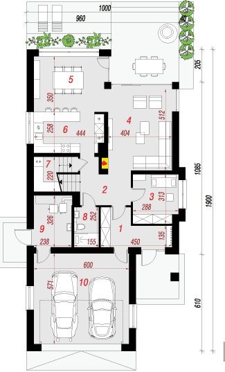 Parterul se remarca printr-o bucatarie spatioasa, care se separa de locul de luat masa printr-un mobilier tip bar si de living printr-un perete modern in care se afla incorporat semineul ce confera o atmosfera relaxanta. Tot la parter mai gasim 1 dormitor, 1 baie, 1 camera tehnica si garajul.
