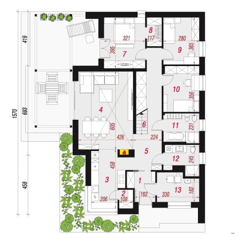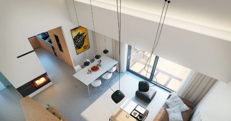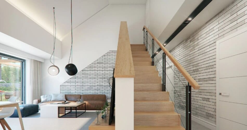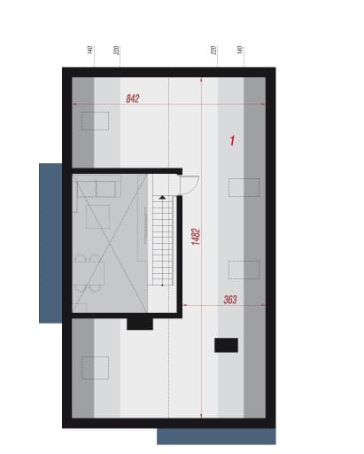 Proiectul acestei case este putin mai diferit decat al altor case, deoarece aceasta are un nivel mai deosebit. Aceasta senzatie este data de prezenta mezaninului, care poate fi utilizat dupa bunul plac, fie ca spatiu de depozitare/pod, ori ca si un etaj superior, unde se mai pot adauga alte dormitoare, spatii de depozitare, etc.